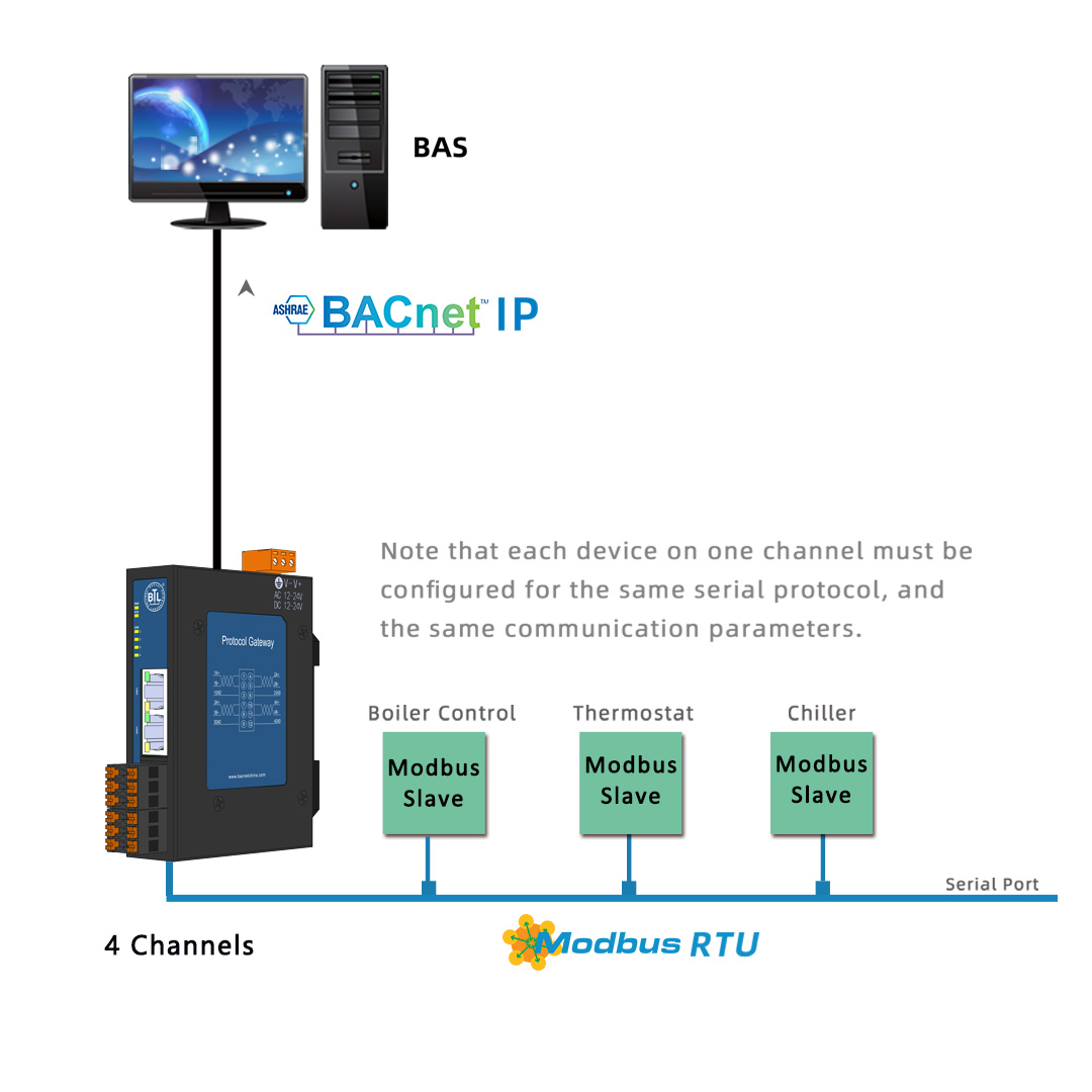 BACnet Gateway, BAC2004-ARM (featuring 2 Ethernet port and 4 RS485 serial ports, dynamically supporting 1024 points), is capable of collecting data from Modbus RTU and more than 500 protocols, and forwarding it to BACnet IP, BACnet MS/TP server, and OPC UA server.