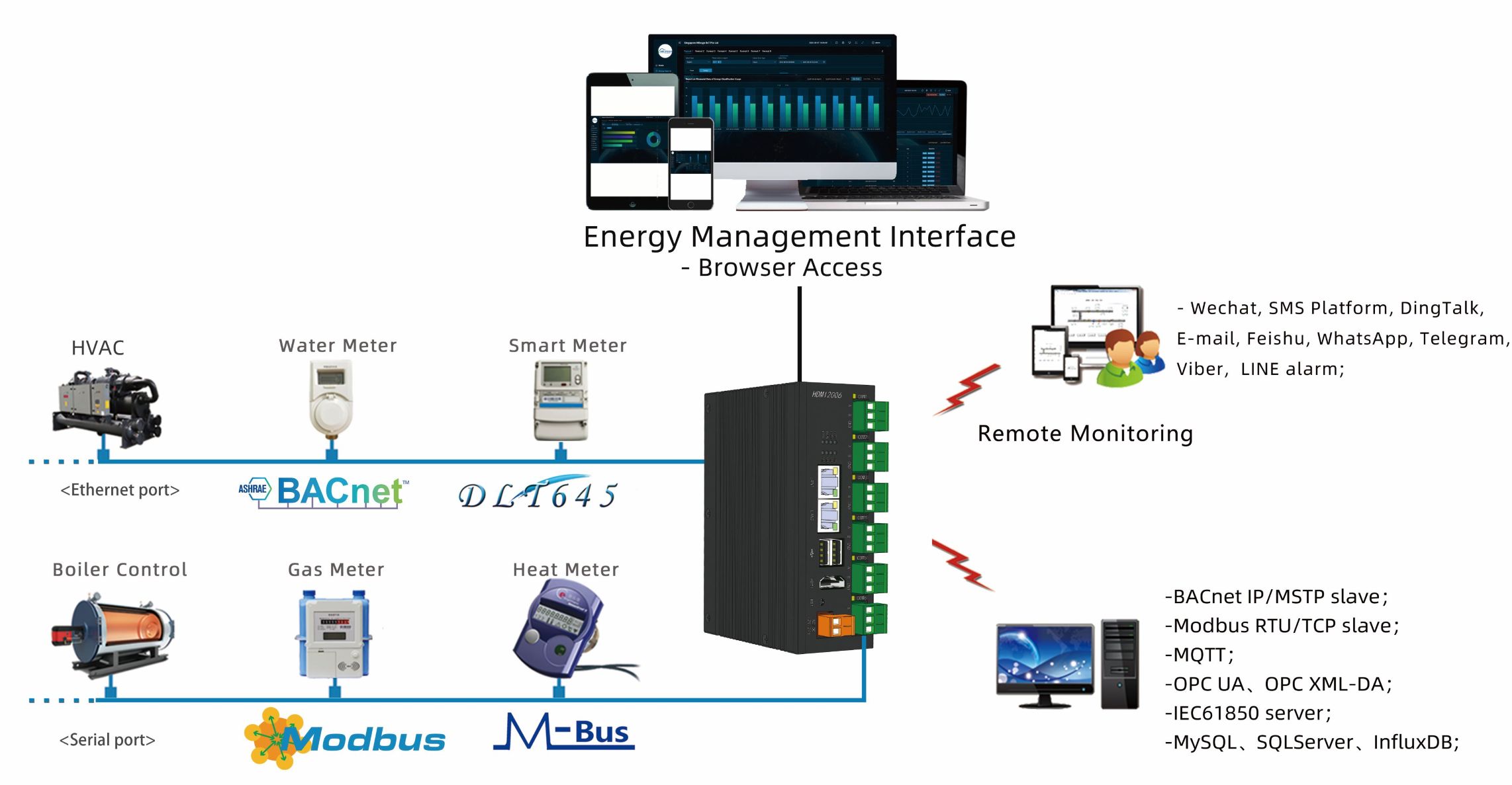 EMS gateway HMI2006-EMS can collect, measure, bill, save and classify data such as water, electricity, gas, cold/hot sources, etc., and has peak, off-peak, valley and flat period electricity consumption records. The data is presented intuitively in the form of tables, pie charts and bar charts.