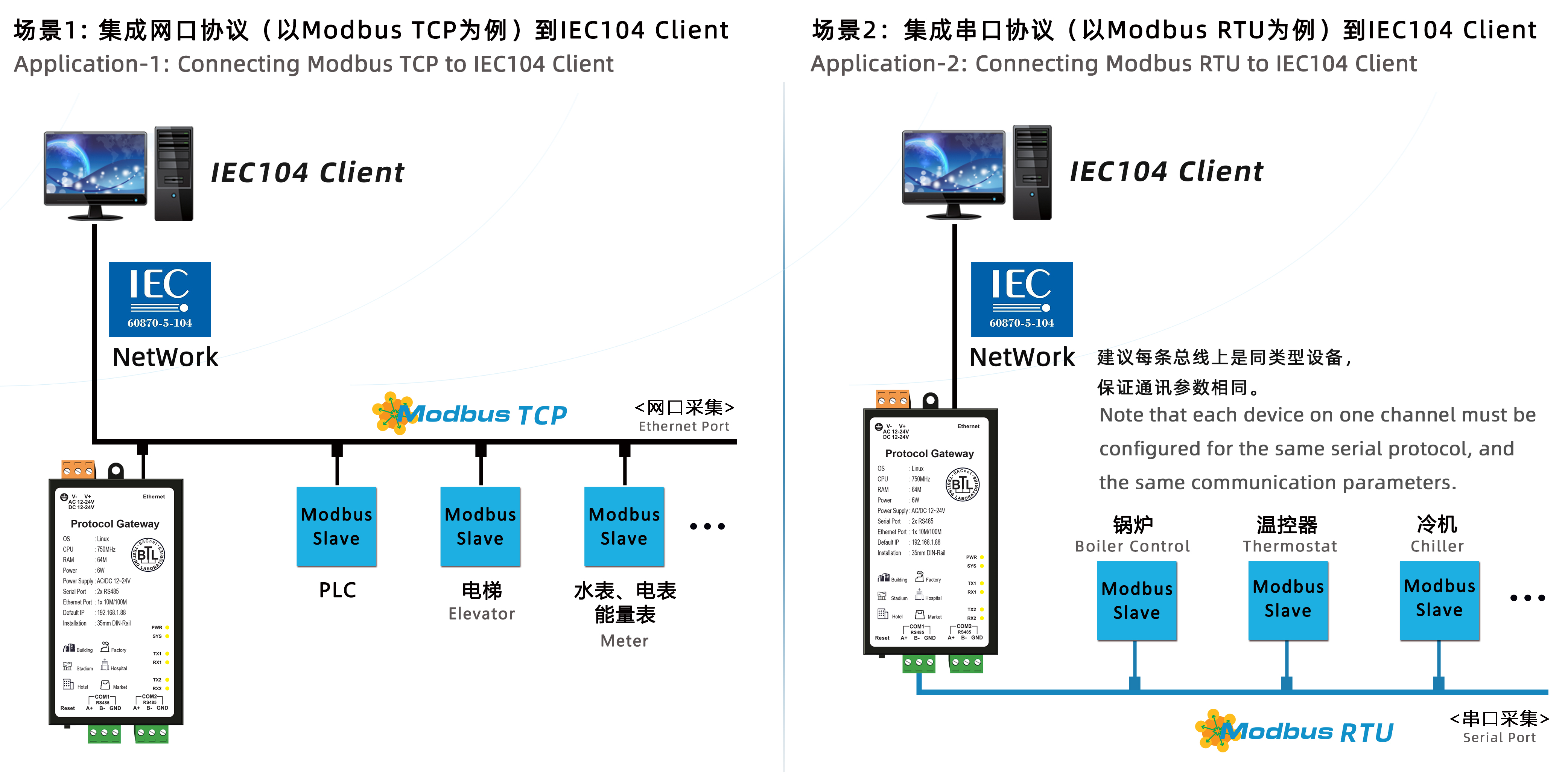 解决PLC、空调、电梯、消防、灯光控制系统、电表、水表不同产品,通过硬件网关将Modbus,BACnet等等其他各家不同的协议转换成IEC104规约,这样IEC104客户端组态软件就可以通过X2IEC104网关访问现场设备了,实现数据采集、数据监控、以及远程读取现场温度、报警状态等各种数据。