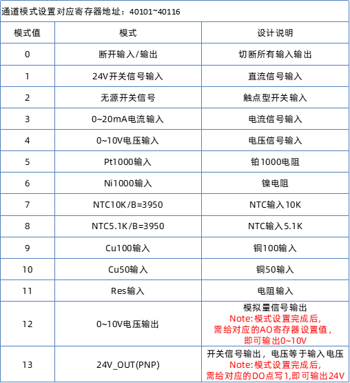 通道模式设置对应寄存器地址 X Mode CFG---Holding Register(0x03/0x06)